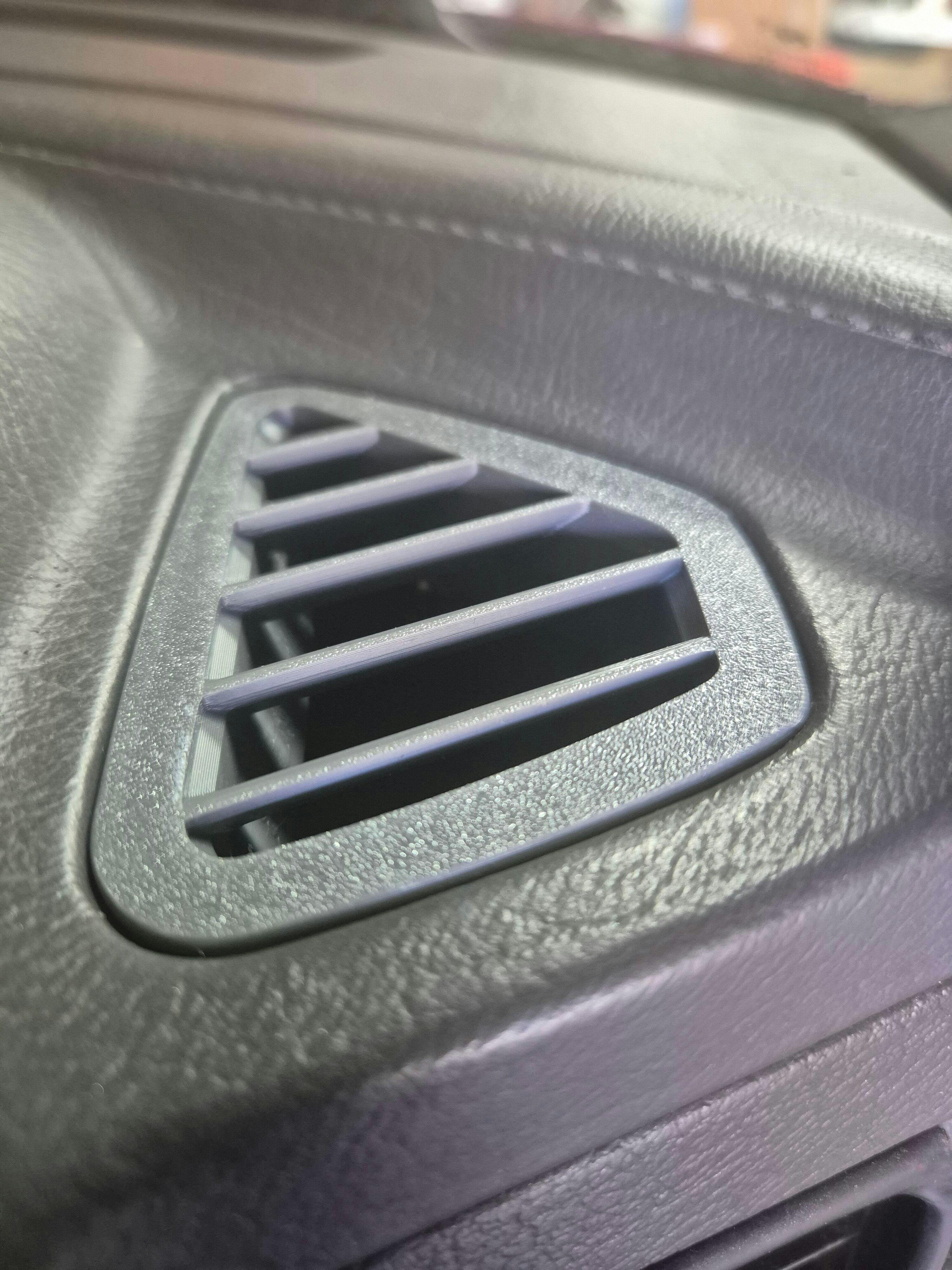3D printed corner defroster/demister vents for 1986-1991 Mazda RX7 model years. Modeled from a 1986. Single piece lofted vent to duct for positive interface with dash duct. Triple spring tabs for secure mounting, designed in mind for broken and cracked dashboard surrounding plastic. EPDM rubber seal and replaceable spring mounting tabs. Vent diffusers or blank plug options available. Printed from UV and impact resistant ASA plastic.